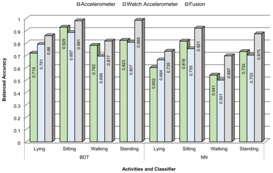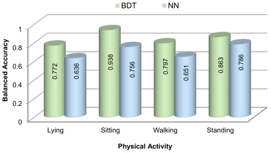 Table 7 provides the average numerical results for PCR based on lying, sitting, walking, and standing activity patterns. Only the phone accelerometer sensor is used in this regard, which provided the macro-F1 scores of 83.1%, 91.1%, 71.1%, and 97.4% in recognizing different phone positions based on lying, sitting, walking, and standing activities, respectively, using the BDT classifier. For the same set of activities, the NN achieved corresponding scores of 49.8%, 34.5%, 31.3%, and 69.8%, respectively, which are quite low as compared to the BDT results. The values of other performance parameters (including accuracy, precision, sensitivity, micro-F1, and log loss) are also better for the BDT classifier. In addition, Figure 5 compares the PCR results in terms of BALACC, where the best recognition performance is also obtained using the BDT classifier. The overall average BALACC value for PCR based on a BDT is 13.5% more than the NN classifier. Moreover, it can be investigated from the figure that the average performance of PCR based on sitting and standing activities is better as compared to other activities.
