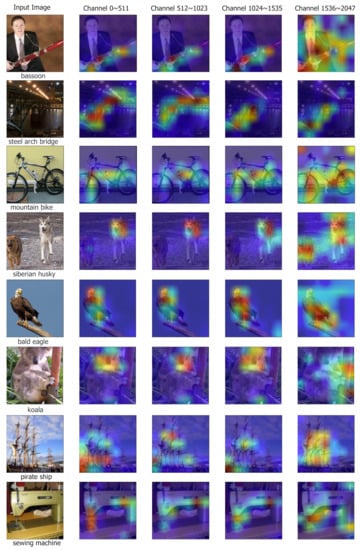 We qualitatively analyze the channels with the Grad-CAM visualization. Figure 2 and Figure 3 shows input images from the validation set and the overlaid Grad-CAM heatmaps with respect to the ground-truth labels. ResNet-50+SSM is the visualization target. To analyze whether the feature splits have learned differently, the visualizations are generated for each 1/4 split of channels, instead of the full feature. The column ‘Channel 0~511’ denotes the Grad-CAM of the first 1/4 channels with respect to the first sub-classifier. The column ‘Channel 512~1023’ denotes the visualization of the second 1/4 channels w.r.t. the second sub-classifier, and so on, while the input to the second sub-classifier is the first 1/2 channels, we visualized the second 1/4 to explicitly compare the semantics learned in each 1/4 channels.