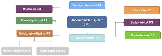 A content-based recommender system creates a user profile by evaluating the characteristics of specific items to predict and produce recommendations [7]. As a result, the suggested objects are typically identical to items that the customer already enjoyed [8]. Collaborative filtering (CF) is a tool that focuses on user views being expressed. It is based on the “word of mouth” principle, which humans have historically used to shape an opinion about a good or service about which they are unfamiliar. The basic principle of this methodology is that the views of other users should be used to make a reasonable estimation of an active user’s interest in a non-ranked object [3]. These methods presume that if users have similar preferences for a set of products, they are likely to have similar preferences for other things they have not yet rated. To produce recommendations, CF employs two distinct mechanisms: memory-based CF and model-based CF. The combination between these two precedent techniques generates the hybrid filtering approach [9]. A risk-aware recommendation system is one that is aimed at preventing and forecasting risks associated with an activity. The demographic-based technique implies that consumers with similar demographic profiles (e.g., age, gender, and country) would have similar interests. As a result, this recommendation system predicts various things based on demographic status. The knowledge-based recommendation system refers to a form of recommender system that is based on explicit knowledge about user preferences and recommendation criteria, such as which item should be recommended in which context. Social network recommender systems are characterized as a combination of social network data that can influence personal behavior and tag data [10]. Context-aware recommendations make use of contextual information in novel ways, such as user behavior, changing weather conditions, and cultural habits.