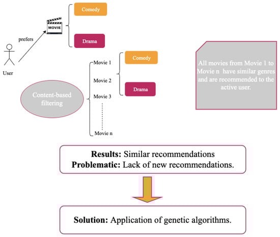 All recommendation systems will inevitably face the over-specialization problem. The over-specialization issue is described as having restricted content and producing suggestions with a low level of novelty and a lack of a method for discovering something unexpected to recommend to the user. When a user likes a new object, the algorithm only recommends related things that the user has already enjoyed as illustrated in Figure 3.
