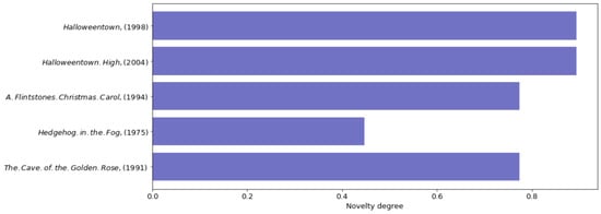 Figure 8 shows the top five movie recommendations for the last population. In this histogram we can compare between new and serendipitous items that are recommended to users. As we can see in Figure 8, both of the first movies have Adventure, Children, Comedy, and Fantasy as genres and have as a degree of novelty because they offer three new genre that could be liked by the users.