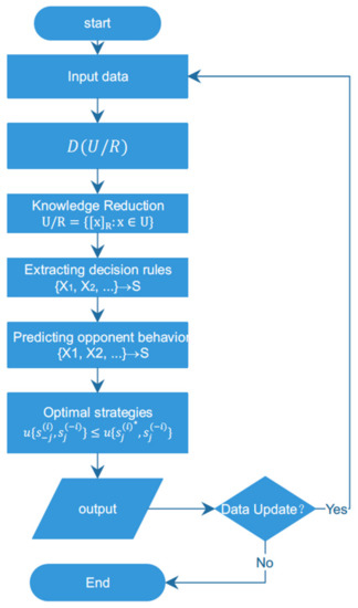 The flow chart for the RS-GT algorithm is given, as shown in Figure 1. The players do not know the opponent’s strategy. They only know the strategy and related information that the opponent has adopted in the past. Because the information is uncertain and fuzzy, data mining methods are used to obtain the required knowledge. The RS-GT model extracts decision rules by mining historical information. The players predict the opponents’ actions and strategies based on the obtained rules to determine their strategies. The players also can develop new market strategies to avoid risks and maximize playoffs. The players obtain the decision knowledge from the mining information of opponents. The players have more understanding about the opponent’s preferences to reach the point of “knowing each other”. The benefit is obtaining greater profits in the market competition.