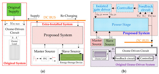 Figure 1a shows the application illustration of the proposed system in this paper. As shown in this application illustration, the two parts are the original system and the extra-installed system. In the original system, the energy of the ozone-driven system is directly supplied by the original supply through DC BUS [28,29]. It is noted that the output voltage of the original supply fits the voltage of DC BUS. To avoid ozone-driven system malfunction when a fault occurs in the original supply, the proposed system is connected to DC BUS. Moreover, both sources are included in the proposed system, the low-voltage PFC source [30,31,32,33] and energy storage devices. As shown in Figure 1, when the main supply delivers the power to DC BUS, the main supply not only provides the energy for the ozone-driven system through DC BUS but also charges the energy storage device simultaneously. When the main supply fails, the energy of DC BUS will be supplied by the proposed system. The master and the slave sources can both provide the energy. If the master source is normal, it can provide the energy for DC BUS and re-charge the energy storage devices through the proposed system at the same time. If the master source provides insufficient energy and causes abnormality, the energy storage devices will provide independently the energy for DC BUS through the proposed system to regulate the energy of each source and maintain the input voltage for the ozone-driven system. Figure 1b shows the extra-installed system illustration of the proposed system. As shown in this block diagram, the proposed system feeds the energy to the original ozone-driven system through DC BUS. When the energy is provided by the master source or the slave source, the voltage signal of each port transfers to the feedback circuit, the controller, and the isolated gate driver to deliver suitable driving signals of the power transistors of the power stage and allow the output voltage of the proposed system to be stabilized. In Figure 1b, the voltage feedback of the ozone load transfers to the original ozone-driven system for stabilizing the ozone generation exciting and the proposed system does not intervene in the ozone control, which means that the proposed system can be applied to any existing ozone-driven system. The application compatibility of the proposed system is higher than any solutions.