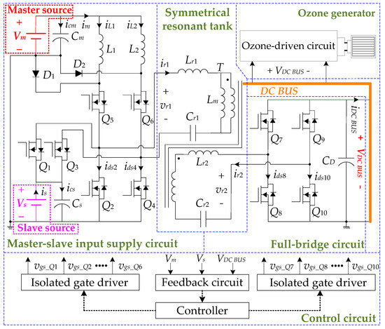 The architecture of the proposed system is shown in Figure 2. There are five parts: a master–slave input supply circuit, a symmetrical resonant tank, a full-bridge circuit, a control circuit, and an ozone generator. The proposed system uses a master–slave input supply circuit formed by six power transistors (Q1–Q6), two inductors (L1 and L2), and two diodes (D1 and D2). D1 and D2 provide current paths when L1 and L2 release the energy in order to avoid a higher voltage spike across the two inductors, which will occur when instantaneous current variation without current freewheeling path emerges. Furthermore, two input ports are designed to let two power sources be applied to this proposed system. The inductors are applied to isolate and store the energy. To smoothly release the energy of the inductors through any path and avoid the energy being delivered to the master source, Q5 and Q6 are located upside down and different as a conventional full-bridge circuit. The proposed system also includes a symmetrical resonant tank composed of two resonant inductors (Lr1 and Lr2), two resonant capacitors (Cr1 and Cr2), and a step-up transformer (T). In addition, the proposed system possesses a full-bridge circuit consisting of power transistors (Q7–Q10) and an output capacitor (CD). The proposed system not only flexibly delivers the energy to DC BUS for the ozone generator but also opportunely recovers the energy from DC BUS. First, the master power supply (Master source) and the energy storage device (Slave source) are connected to the master–slave input supply circuit. Both the output of the full-bridge circuit and the ozone generator are connected to DC BUS. When the original source connects directly to DC BUS and provides the ozone generator and the proposed system with the energy, the frequency of Q7–Q10 will be controlled to convert the energy of DC BUS to the voltage at high frequency, which is transferred through the symmetrical resonant tank and the transformer, and the high-frequency voltage signal is rectified and stabilized by the body diodes of Q1–Q4 and capacitor Cs, respectively. Finally, the energy will be charged to the energy storage device (the slave source). When the original source fails, the energy of the ozone generator must be provided through the proposed system. The master source (Vm) delivers the energy through the master–slave input supply circuit with the high-frequency square AC voltage being converted by controlling the frequency of Q1–Q6. This high-frequency square AC voltage passes through the symmetrical resonant tank and the transformer and is rectified and stabilized by the body diodes of Q7–Q10 and capacitor CD, respectively. Next, the energy of CD is transferred to the ozone generator through DC BUS. In addition, to ensure that the energy storage device (the slave source) maintains high voltage levels for full charging, the master source provides the energy to the energy storage device by controlling the frequency of Q1–Q6. If a fault occurs in the master source, the energy will be provided by the slave source (Vs) by controlling the frequency of Q1–Q6 to convert the energy of the slave source to the high-frequency square AC voltage, which was transferred through the symmetrical resonant tank and the transformer and is rectified and stabilized by the body diodes of Q7–Q10 and the capacitor CD, respectively. Subsequently, the energy of CD is transferred to the ozone generator through DC BUS.