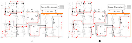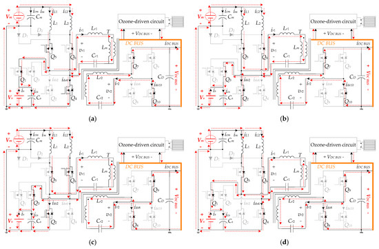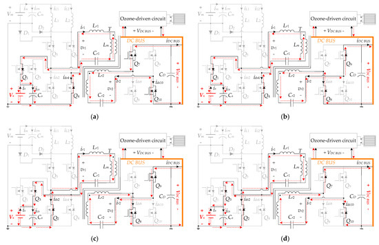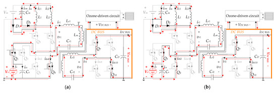 Ozone technologies have seen wide application in various fields, such as agriculture, sterilization [1,2,3], water purification [4,5,6], portable air cleaners [7,8], and surface cleaning [9,10]. In ozone technology applications, signals with both high-voltage and high-frequency features must be generated to achieve proper electrical discharge in the ozone chip. Therefore, a suitable driving circuit or system circuit design is crucial. In some studies, advanced components with a high-frequency capacity have been used to build the ozone load driving resonant circuit [11,12,13,14]. In addition, resonant circuit designs such as LCC type or hybrid type have been adopted, due to the high voltage-gain property, to generate a high-voltage signal in a high-frequency range [15,16,17,18]. The existing ozone-driven systems are most often designed with a single input port. If a fault occurs in the power source during operation, the ozone-driven system must stop working and wait for power recovery, which significantly affects the ozone quality. Adopting designs using a single power source inevitably impairs the operational reliability of the ozone-driven system in the above application fields. To improve the reliability of the input source, connecting directly the energy storage devices to the ozone-driven system may seem to be a quick fix. However, there are issues that remain to be resolved to achieve the voltage balance between the energy storage device and the input power source.