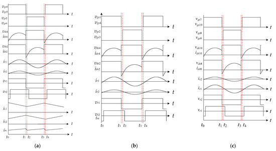 - Mode I (t0–t1): As shown in Figure 3a, Q2 and Q6 are turned off and Q4 and Q5 are turned on, achieving zero-voltage switching in this mode; the energy of the master source is stored in inductor L2 by turning on Q4 and releasing the energy of inductor L1, which is stored in the energy storage device and Cs by turning on Q5 and the diode of Q1. Therefore, the currents of L1 and L2 (iL1 and iL2) linearly decrease and increase, respectively. At this time, since the resonant voltage vr1 of the primary side is a positive square wave, the resonant current ir1 of the primary side flowing through Q1 and Q4 is positive and the resonant current ir2 of the secondary side flows through the body diode of Q7 and Q10 to transfer the energy to DC BUS with output capacitor CD. It is noted that the current im of the master source has low ripples because iL1 and iL2 are interleaved to store and release energy, which can contribute to mitigating the burden of the master source supply. This operation enters the next mode until Q4 and Q5 are turned off.