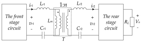 Figure 7 depicts the configuration of the symmetrical resonant tank, where Lr1 and Lr2 are the resonant inductors, Cr1 and Cr2 are the resonant capacitors, T is the transformer, and Lm is the magnetic inductor of the transformer. vr1 is the resonant voltage of the primary side, which is generated by the front stage circuit. vr2 is the resonant voltage of the secondary side, which is generated by the symmetrical resonant tank and input into the rear circuit. RL is the equivalent load of DC BUS and Vo is the output voltage after rectification and stabilization by the rear stage circuit such as VDC BUS of Figure 2. To select the resonant capacitor, the operation frequency fs must be defined first, and the resonant inductor can be determined from Equation (5), as follows: