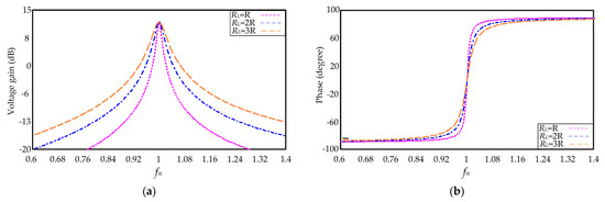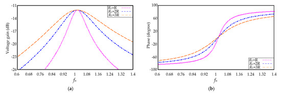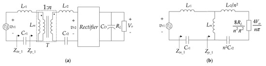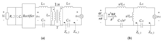 Next, the analysis of voltage gain and impedance phase is described when the energy is provided from the master source or the slave source, as shown in Figure 8. As shown in Figure 8b, the equivalent circuit of Figure 8a, to consider the variation of RL, the impedance of the transformer is mapped to the primary side of the transformer, where Lr2/n2, n2Cr2, and 8RL/n2π2 are the resonant parameters that mapped to the primary side from the secondary side, and these resonant parameters are in parallel connection with magnetic inductor Lm. This resonant equivalent impedance Zp_1 is calculated as