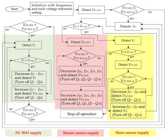 Figure 12 shows the control flowchart of the proposed system, where three modes of power deliveries are studied. This flowchart starts with the initialization of frequency and each voltage reference setting. The controller begins with the acquisition of the voltage of DC BUS (VDC BUS) from the feedback circuit. On comparing VDC BUS with the setting voltage of VDC BUS (VDC BUS-ref), if VDC BUS is lower than or equal to VDC BUS-ref, then the process goes to voltage detection of the master source (Vm). If Vm is larger than or equal to Vm-min, it means that the energy of the master source is sufficient. Yet, if VDC BUS is still lower than VDC BUS-ref, it implies that the energy is insufficient for the ozone-driven system. Next, the controller decreases frequencies of Q2, Q4, Q5, and Q6 (fQ2, fQ4, fQ5, and fQ6) to raise the voltage gain and detects repeatedly VDC BUS until VDC BUS is larger than or equal to VDC BUS-ref. Subsequently, the frequencies of Q2, Q4, Q5, and Q6 (fQ2, fQ4, fQ5, and fQ6) are increased to reduce the voltage gain. If VDC BUS is lower than or equal to VDC BUS-ref, the process is back to detecting Vm. Conversely, the operation mode is changed. This operation mode is called the master source supply mode in the flowchart in Figure 12.