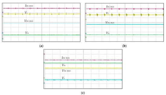 Experiment waveforms of the voltage of the master source supply, the voltage of the slave source supply, and the voltage and the current of DC BUS under (a) the master source supply mode, (b) the slave source supply mode, and (c) the DC BUS supply mode. (Vm: 50 V/div, Vs: 50 V/div, VDC BUS: 200 V/div, IDC BUS: 2 A/div, and time: 10 μs/div).