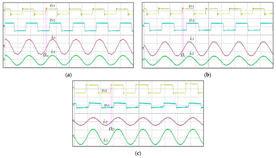 Here, the resonant property with the voltage and the current of the resonant circuit is verified under different operation modes, as shown in Figure 15. According to Figure 15a, the proposed system operates in the master source supply mode. The input voltage of the resonant circuit (vr1) can be observed. vr1 is seen to lead the input and the output current (ir1 and ir2) with a phase difference of θm, which means that the resonant property is exhibiting the inductive characteristics to help in the achievement of zero-voltage switching (ZVS). In Figure 15b, the proposed system is in the slave source supply mode and vr1 still leads ir1 and ir2 with a phase difference of θs, which implies that the resonant property is exhibiting the inductive characteristics to help achieve ZVS. It is noted that though the front of the proposed system is an integrating circuit design, the power transistors of the front of the proposed system can still achieve the condition of ZVS. In Figure 15c, the DC BUS supply mode is operated in the proposed system and vr2 also leads ir1 and ir2 with a phase difference of θD, which means that the inductive characteristic is exhibited in this resonant circuit even if the energy is provided from DC BUS for the output of the resonant circuit, which helps to achieve ZVS. Through the resonant property verification, the test results of the resonant property can meet the design of the resonant circuit, which can achieve the inductive property to help achieve ZVS irrespective of the supply mode under which the proposed system is operating.