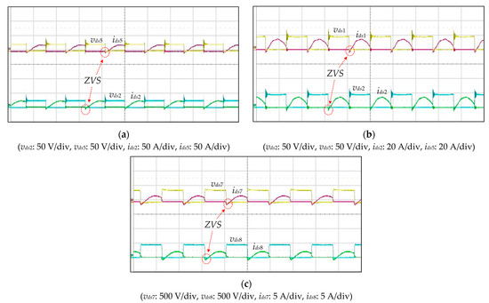 In this section, zero-voltage switching (ZVS) achievement is verified in the test results. Please refer to Figure 16 for an explanation. Here, the voltage and the current for the power transistors of the proposed system must be observed while power transistors turn on. In Figure 16a, when the operation mode is the master source supply, negative currents (ids2 and ids5) flow through the body diodes of Q2 and Q5 before the voltages (vds2 and vds5) become zero. When vds2 and vds5 become zero because Q2 and Q5 are turned on, ids2 and ids5 flow through Q2 and Q5, realizing zero-voltage switching. In Figure 16b, when the operation mode is the slave source supply, the currents (ids1 and ids2) are negative and flow through body diodes of Q1 and Q2 before Q1 and Q2 are turned on. Until the voltages (vds1 and vds2) become zero because Q1 and Q2 were turned on, ids1 and ids2 become positive and flow through Q1 and Q2 to achieve ZVS. In Figure 16c, the system is operating in the DC BUS supply mode and negative currents (ids7 and ids8) flow through body diodes of Q7 and Q8 before Q7 and Q8 are turned on. When the voltages (vds1 and vds2) become zero since Q7 and Q8 are turned on, ids7 and ids8 become positive and flow through Q7 and Q8 because of ZVS. These testing results show that the power transistors can be operated under ZVS regardless of the operation mode this proposed system is operating in, implying that the switching loss can be reduced effectively.