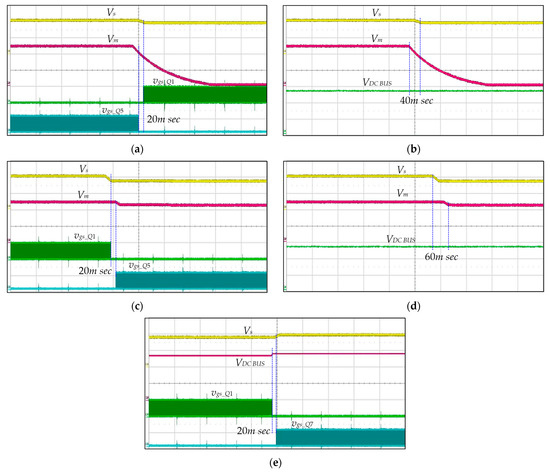 Experiment waveforms of (a) show the driving signal verification when the master source supply mode changes to the slave source supply mode, (b) depict the voltage of each port when the master source supply mode changes to the slave source supply mode, (c) elucidate the driving signal verification when the slave source supply mode changes to the master source supply mode, (d) show the voltage of each port when the slave source supply mode changes to the master source supply mode, and (e) show the driving signal verification when the slave source supply mode changes to the DC BUS supply mode, (Vs: 20 V/div, Vm: 20 V/div, VDC BUS: 150 V/div, vgs_Q1: 5 V/div, vgs_Q5: 5 V/div, vgs_Q7: 5 V/div, and time: 100 ms/div).