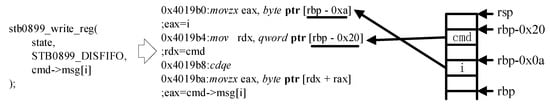Next, P1OVD narrows the scope of possible root instructions again by variable-based data dependency analysis because variables represent the behavior of the statement in most cases. For example, the vulnerable statement cmd->msg[i] contains two important variables cmd and i and they are combined to generate an out-of-bounds vulnerability. The variable names can be easily obtained by parsing source codes. However, when variables are parameters of operator sizeof they can be turned into a constant and disappear from binaries due to the preprocessing. For example, sizeof(cmd->msg)) corresponds to the immediate number six in the binary. So P1OVD excludes all variables that are only used in the operator sizeof. After extracting variable names, P1OVD uses debugging information to map variable names to rbp related addresses on the stack because without optimization, the GCC compiler stores each local variable on the stack. Since each extracted variables are part of the original statements, the root instructions should data-depend on all extracted variables. Thus, P1OVD performs a data dependency analysis to exclude irrelevant instructions. We define an instruction data-depends on a certain variable if it directly uses the rbp related address or uses the result of another instruction that is data-dependent on the variable.