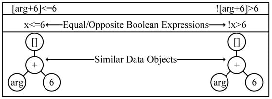As Figure 6 shows, to match the [arg + 6] <= 6 and ![arg + 6] > 6, P1OVD first extracts data objects from them. The extracted data objects are both [arg + 6] and they are structurally similar obviously. So P1OVD replaces them with a single symbol x in their original AST. Then P1OVD checks the solving possibility of conditions and . Results show satisfies the first constrain and the second constrain will never be satisfied, thus P1OVD finds that the two branching conditions are equal. So, in conclusion, the two ASTs represent the same branching condition. At the same time, both strict matching and graph-similarity-based matching cannot distinguish such changes in ASTs.
