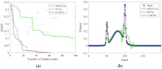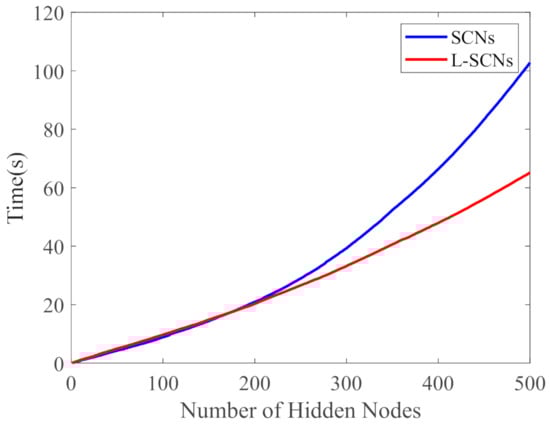 It can be seen from the above description that the difference between the two methods lies in the calculation of the output weights . SCNs obtains the output weights by the product of M–P generalized inverse matrix and the output , while L-SCNs evaluates the output weights by positive definite equation and Cholesky decomposition, since the M–P generalized inverse is calculated using the SVD method. Therefore, the computational complexity of the output weights of SCNs is about . While L-SCNs only involves simple addition, subtraction, multiplication, and division operations when calculating output weights, so the computational complexity is about . Where M is the number of samples in the training set of classification, and d is the number of categories (d = 1 in the regression problem). In summary, the method proposed in this paper has obvious lightweight advantages when dealing with complex tasks that require a large number of hidden nodes.