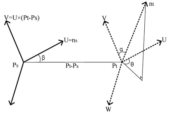 The FPFH descriptor is an improved version of the PFH descriptor, which is computed as a histogram of geometric properties at a point [29]. Within the range of middle point with radius , the computation is based on the estimated angle and positional relationship between normal vectors and for the nearest k neighbors point pair and . Figure 1 presents the relationship of two points in UVW local coordinate system. The ,, and parameters () are calculated as (3):