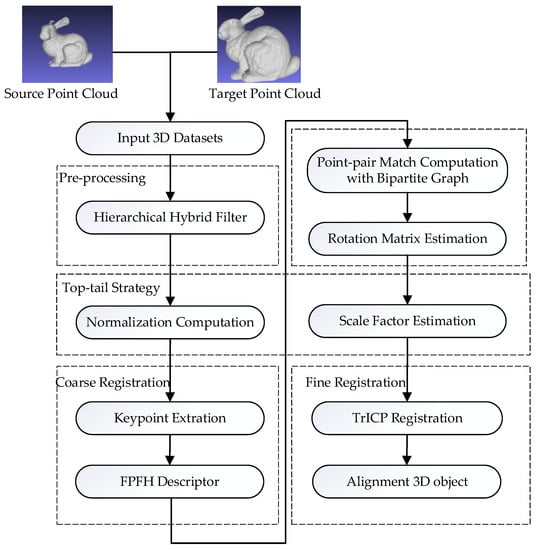 In this section, we detail the coarse-to-fine registration algorithm based on bipartite graph perfect matching for scaled 3D data. The design scheme of proposed registration algorithm described in Figure 2 contains four phases: data pre-processing, TT strategy, coarse alignment and fine registration. The specific steps of these phases include filter process, point cloud normalization process, key points extraction, FPFH descriptor presentation, bipartite graph construction, correspondence point pair confirmation, initial rotation matrix estimation, scale factor estimation and fine registration.