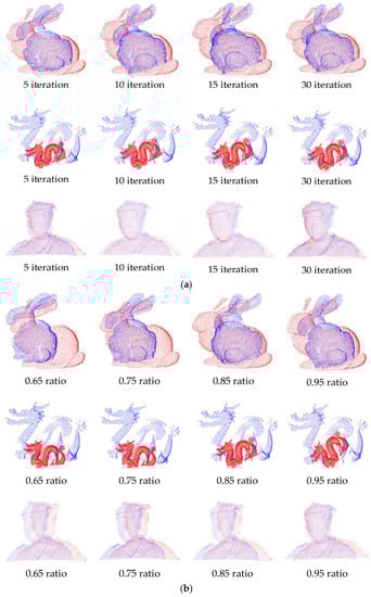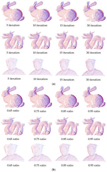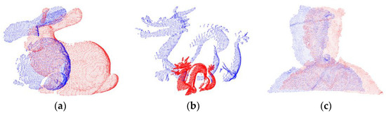 The registration visual results of ICP and TrICP are presented in Figure 6a,b, respectively. We can obviously find that both of the algorithms have a bad registration effect in the bunny rabbit and scaled dragon, which indicates that ICP and TrICP have a bad ability to process PCD sets with a poor initial position and scale variations. Figure 7 illustrates the registration results of coarse-to-ICP and coarse-to-TrICP for bunny rabbit, scaled dragon and scanned face, which shows that the two algorithms can perform well in all three data sets. By comparing these visual results, our coarse registration method with TT strategy conducts very well, which significantly enhances comprehensive availability of original ICP and TrICP.