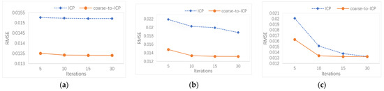 The RMSE records of ICP and coarse-to-ICP with different iterations. (a) RMSE values of ICP and coarse-to-ICP for bun045 and bun090 with 5, 10, 15, 30 iteration number. (b) RMSE values of ICP and coarse-to-ICP for dragon000 and magnified twice dragon048 with 5, 10, 15, 30 iteration number. (c) RMSE values of ICP and coarse-to-ICP for face000 and face045 with 5, 10, 15, 30 iteration number.