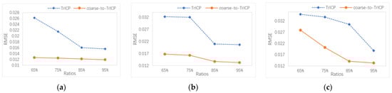 The RMSE records of TrICP and coarse-to-TrICP with different ratios. (a) RMSE values of TrICP and coarse-to-TrICP for bun045 and bun090 with 0.65, 0.75, 0.85, 0.95 ratio settings. (b) RMSE values of TrICP and coarse-to-TrICP for dragon000 and magnified twice dragon048 with 0.65, 0.75, 0.85, 0.95 ratio settings. (c) RMSE values of TrICP and coarse-to-TrICP for face000 and face045 with 0.65, 0.75, 0.85, 0.95 ratio settings.