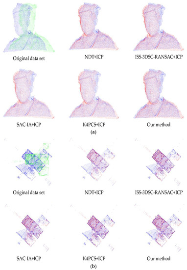 With the rapid development of optical measurement technology, three-dimensional (3D) models of real-world objects with different views have been employed to collect data for many application scenarios [1,2,3,4,5]. As the fundamental technique in 3D data processes, the registration method is mainly responsible for determining the correspondence and transformation of multiple-view 3D data, which facilitates the implementation of many reverse engineering applications, such as multi-platform data alignment for airborne and terrestrial laser scanning [6], foot alignment for reconstruction in the footwear consumer field [7], remote sensing image registration in military and civilian fields [8], skull registration for craniofacial reconstruction in the medical field [9], cross-source point cloud registration in large-scale scanned data for street views outdoors [10], 3D face registration for face recognition [11], etc. During the past few decades, the high-performance registration method has become an increasingly important research topic. However, the existing registration algorithms still have many defects in terms of efficiency and accuracy in practice. According to the transformation relationship of different-view 3D data, registration methods can be divided into rigid registration algorithms and non-rigid registration algorithms. In this paper, we mainly focus on rigid alignment methods with some extensibility, and all processed 3D data is PCD.