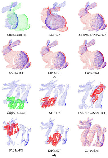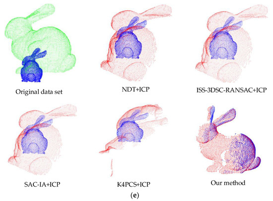 For Figure 10a,b, the visual alignment results of face and room data sets apparently show that all five coarse-to-fine registration algorithms can effectively process PCD with obscure or general features. However, in Figure 10c, the visual results indicate that the alignment effect of a bunny rabbit with four compared coarse-to-fine registration algorithms, especially the NDT + ICP algorithm, is worse than the method proposed in this paper. This proves that our proposed algorithm is more robust in processing low overlap PCD sets. Moreover, Figure 10d,e reveals that four common coarse-to-fine algorithms fail in scaling alignment, except for the proposed method.