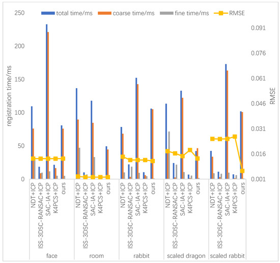 The numerical records and analysis of five coarse-to-fine algorithms about alignment time and accuracy for different datasets are presented in Figure 11: the horizontal coordinates are grouped by dataset name, where each group covers five registration algorithms (four compared algorithms and our proposed algorithm); the main vertical coordinate indicates the time in milliseconds, where the total registration time in blue bars, the coarse registration time in orange bars and the fine registration time in gray bars follow this axis; the secondary vertical coordinate shows the RMSE, where the registration errors of the five algorithms in all data models, represented by yellow boxes connected by yellow solid lines, follow this axis. As shown in Figure 11, the average registration time of NDT + ICP, ISS-3DSC-RANSAC + ICP, SAC-IA + ICP, K4PCS + ICP and our method for all data sets is 96.1208 ms, 17.2456 ms, 168.6878 ms, 10.377 ms and 76.081 ms, respectively. Analyzing from the perspective of algorithm execution efficiency, we can conclude that K4PCS + ICP is the highest and SAC-IA + ICP is the lowest, and our algorithm performs generally. For the non-scale point cloud object face and room, all five algorithms have similar small registration error, which indicates that these methods have close accuracy for aligning PCD with small position deviations or few features. However, our algorithm has the smallest 0.0117964 RMSE of bunny rabbit with poor initial position, which shows the proposed method has superior performance in processing low overlap rate PCD sets. Moreover, for data sets with scale variations, the RMSE of the four coarse-to-fine alignment algorithms is much higher compared to our proposed algorithm, which implies that these four algorithms fail to register scaling data sets and our proposed methods have more generality.