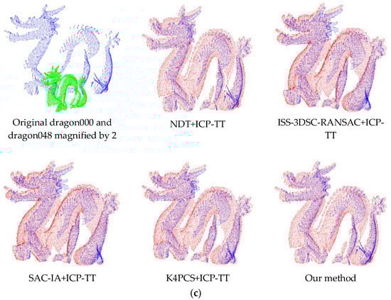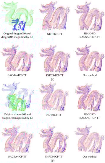 In order to test the performance of the coarse process in different coarse-to-fine algorithms combined with the TT strategy proposed in this paper, we scale the bunny rabbit and dragon data sets with multi factors (0.5, 1.5, 2) to simulate isotropic scale cases and form testing data sets: dragon000-dragon048 magnified 0.5 times, dragon000-dragon048 magnified 1.5 times, dragon000-dragon048 magnified 2 times, bun045-bun090 magnified 0.5 times, bun045-bun090 magnified 1.5 times and bun000-bun090 magnified 2 times. The experiment is conducted with the same coarse-to-fine registration algorithms mentioned in Section 4.2. The four course methods of NDT, ISS-3DSC-RANSAC, SAC-IA and K4PCS combine with the TT strategy, respectively, to modify NDT + ICP as NDT + ICP-TT, ISS-3DSC-RANSAC + ICP as ISS-3DSC-RANSAC + ICP-TT, SAC-IA + ICP as SAC-IA + ICP-TT, and K4PCS + ICP as K4PCS + ICP-TT. Figure 12 and Figure 13 respectively record the visual registration results of dragon and bunny rabbit with different scaling variations. In Figure 14, we compare scale estimation value with the real scale factor. Moreover, the registration errors are recorded and analyzed in Table 4 and Figure 15.