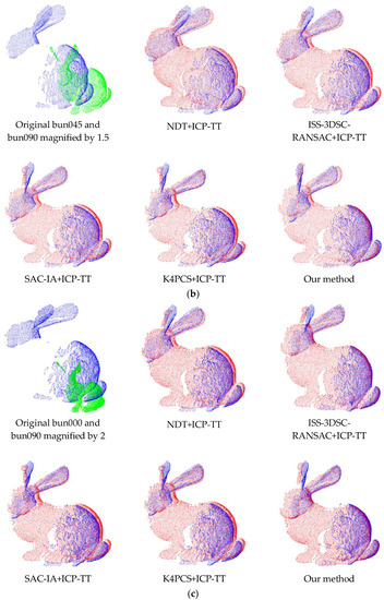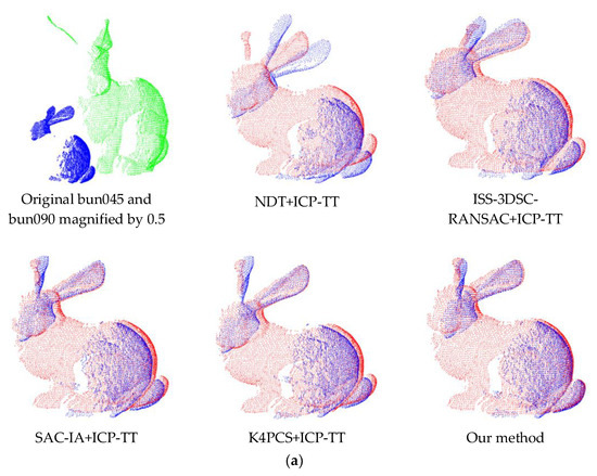 In Figure 12 and Figure 13, the original source data are colored in green, the scaled target object is labeled in blue and registered scaled-adjusted target object is shown in red. From the visual registration results in these figures, we find that the NDT + ICP-TT is less stable (large deviations in bun045 and bun090 magnified by 0.5), the performance of ISS-3DCS-RANSAC + ICP-TT, SAC-IA + ICP-TT and K4PCS + ICP-TT are close to each other, and our method is better. Our proposed TT strategy can extend the four coarse-to-fine registration algorithms to scale scenes effectively.