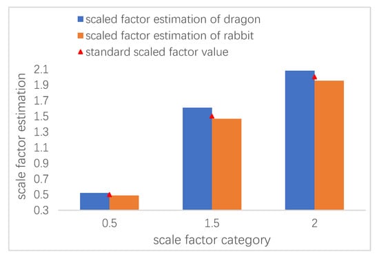 Figure 14 records scale factor estimation value of dragon and bunny rabbit data sets with different scale factors. The x-axis represents the scale factor category, the y-axis represents the scale estimation value, the blue bar indicates the scale factor estimation value of the dragon data set, the orange bar indicates the scale factor estimation value of the bunny rabbit object, and the red triangle shows the real scale factor value. For scale factor 0.5, the estimation value for dragon and bunny rabbit is 0.520670 (+4.13% error) and 0.488558 (−2.23% error). For scale factor 1.5, the estimation value for dragon and bunny rabbit is 1.61036 (+7.36% error) and 1.46719 (−2.19% error). For scale factor 2, the estimation value of dragon and bunny rabbit is 2.08243 (+4.12% error) and 1.95423 (−2.29% error). The average error of our scale-estimation value for dragon and bunny rabbit is −2.24% and +5.2%.