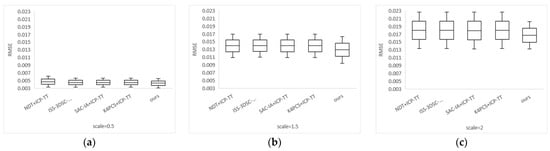 The RMSE boxplot of five coarse-to-fine registration algorithms combined with TT strategy in different scale factors. (a) The RMSE boxplot of different coarse-to-fine registration algorithms combined with TT strategy in scale = 0.5. (b) The RMSE boxplot of different coarse-to-fine registration algorithms combined with TT strategy in scale = 1.5. (c) The RMSE boxplot of different coarse-to-fine registration algorithms combined with TT strategy in scale = 2.