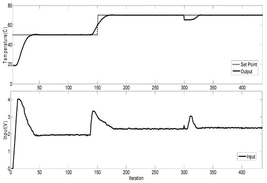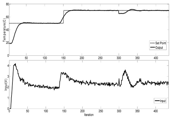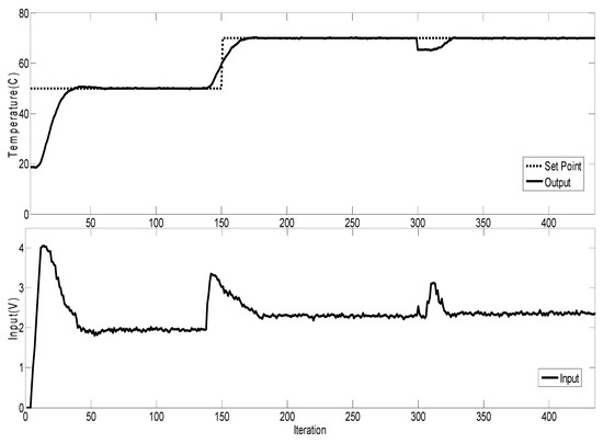 In this section, the task was to implement the proposed RFPC-GGP controller of the thermal system. Our purpose was to control the metallic rod temperature with respect to the dynamic process change, caused by the sensor position change at the sample time 300.
