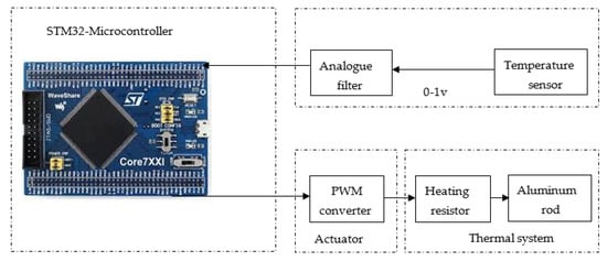 The analog control was injected into the real system. Subsequently, the output voltage of the real system which is in the interval of 0–1 V is processed after an analogue filter to make it in an interval of 0–3.3 V, since the voltage range supported by the STM32 input–output ports is 0–3.3 V. This analog output is sent to the STM32 that converts it using ADC to a digital value and sends it to the Keil compiler (Figure 7).