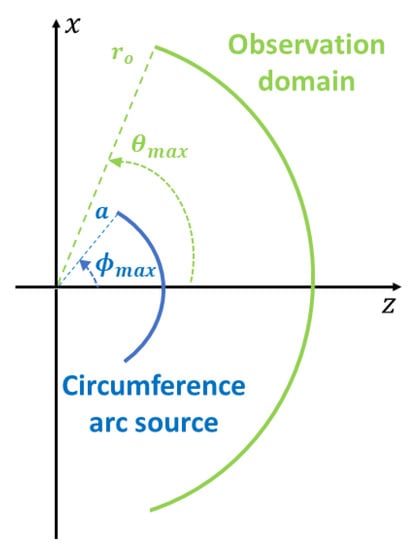where . As is well known, such current radiates an electric field focusing at . The far field is observed on a circumference arc spanning the interval .