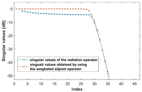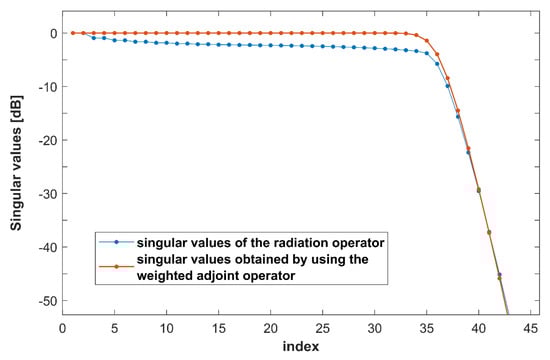 In this section, some numerical experiments related to the analytical results for the near-field are sketched. A circumference arc source with and is considered. The source current is chosen as in (66) with . The radiated field is observed on a circumference arc with and . With reference to such a configuration, in Figure 8 the actual singular values of the radiation operator are compared with those obtained by considering the weighted adjoint.