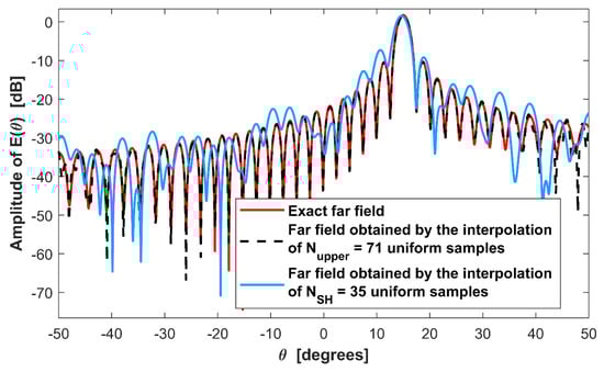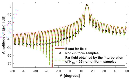 In order to highlight the better performance of the non-uniform sampling with respect to the uniform one, in Figure 7 also the far field obtained by the interpolation of uniform samples is sketched. In particular, the blue line shows the field interpolated starting from uniform field samples while the green dashed one shows the one obtained from samples.