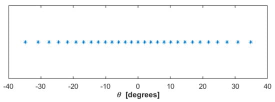 As it is clear from Figure 4, the use of a weighted adjoint changes the behavior of the singular values but not the index at which they decay abruptly. The latter is predicted by (27) which, in the considered test case, returns in perfect agreement with the diagrams in Figure 4. In Figure 5, the optimal sampling points of the far-field in the variable are shown. They are non-uniformly arranged along the observation domain. In particular, the sampling step is minimum around the direction , whereas it increases by moving towards the directions .