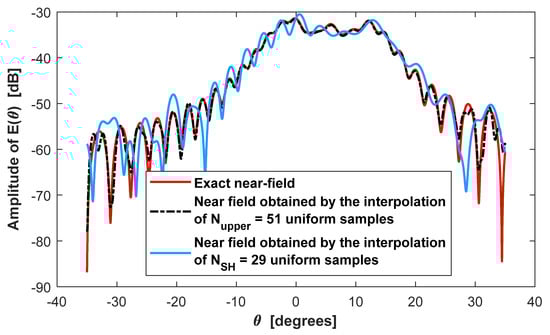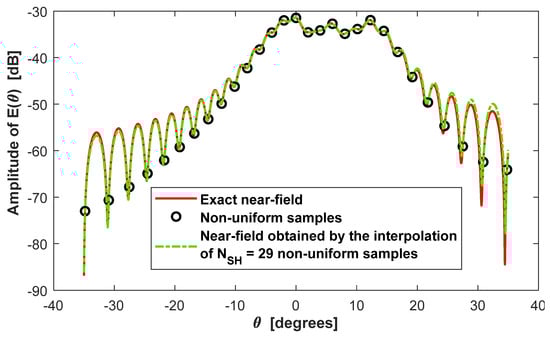 As can be seen from Figure 6, despite the interpolation Formula (32) exploits a number of samples that is as low as possible (only non-uniform field samples are used for the interpolation), the interpolated field agrees very well with the exact field and 0.028.