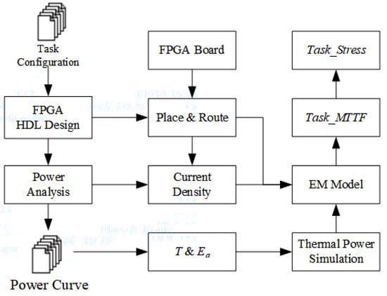 where denotes the linewidth constant, which is determined by the properties of the metal interconnects within the FPGA, and , the shape parameter, can be used to represent the hardware fault profile. In this paper, we do not consider the effect of process variations in the model. Hence, the shape parameter remains constant. k denotes the Boltzmann constant, J − Jcrit denotes the offset of the current density with and without electromigration, T denotes the Kelvin temperature, and denotes the activation energy. The above parameters can be obtained by FPGA design software and power analysis tools, and the flow of calculating Task_Stress is shown in Figure 3.