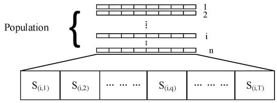 In GA, a population is a collection of individuals, and individuals are entities with chromosome characteristics. Population and individuals are shown in Figure 4. Each chromosome corresponds to an individual, namely a set of solution results. Chromosomes are composed of genes, and genotypes are encoded by phenotypes that can be regarded as independent variables.