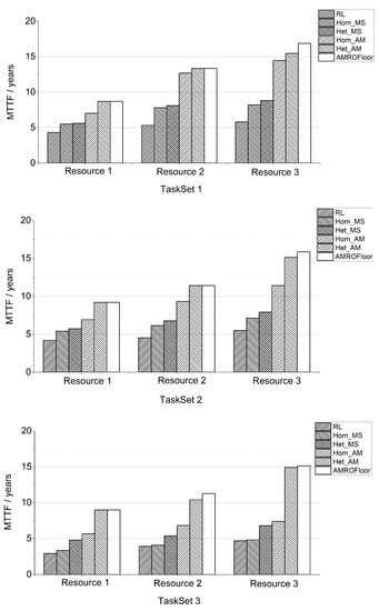 MTTF of different methods in three task sets under three resources.