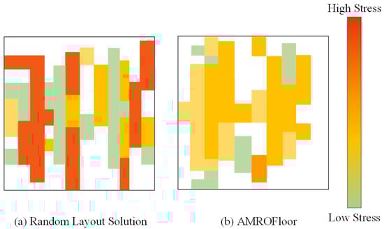 In this case, 5% of the total on-chip resources are selected to place the task. Figure 8 shows the comparison of the results of the two layout solutions. The Random layout uses 4.95% of on-chip resources, while the AMROFloor uses 4.16% of on-chip resources; In terms of on-chip stress, the stress distribution of AMROFloor is more balanced. The maximum single RR stress of the Random layout is 7.4, and the maximum single RR stress of AMROFloor is 5. In summary, the CRU of AMROFloor is reduced by 15.96%, and the MTTF is increased by 32.5%.
