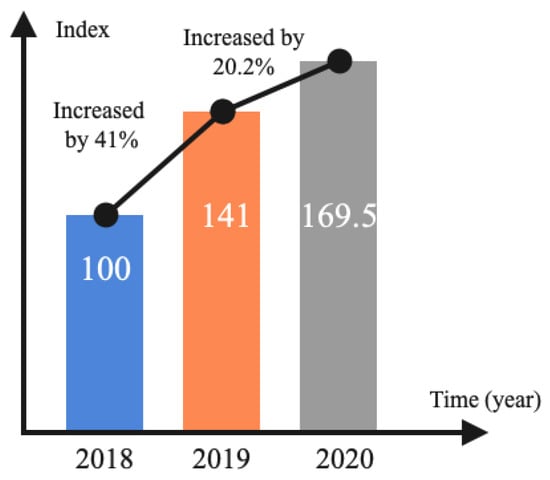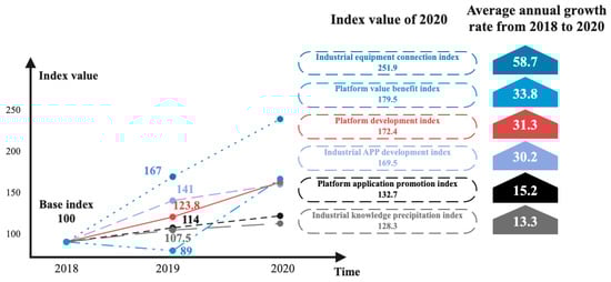 - 2018’s base period index is 100, and the sub-index value cnij of each year is calculated as follows:where Cn1—Industrial equipment access index of the nth year; Cn2—Industrial knowledge accumulation index of the nth year; Cn3—Industrial APP development index of the nth year; Cn4—Platform application promotion index of the nth year; Cn5—Platform value benefit index of the nth year.