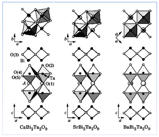 Crystal structure of ABi2Ta2O9, where A = Ca, Sr, Ba.