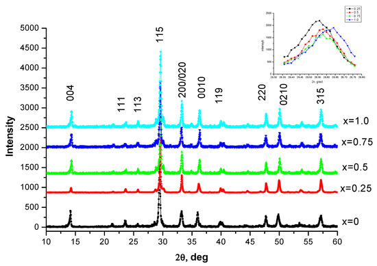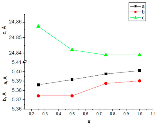 Figure 5 shows the dependence of the unit cell parameters a, b, c on the parameter x. As seen from Figure 5, parameter a and b increase, while parameter c decreases for the entire series of compounds. It should also be noted that, despite the decrease in the thickness c′ of the perovskite layer, the volume of the unit cell V increases. The change in the unit cell parameters a, b, c, V and APs Bi3−xNdxTi1.5W0.5O9 (x = 0.25, 0.5, 0.75, 1.0) is associated, among other things, with the difference in radii in the ions in position A, which have a dodecahedral layer, where position A is occupied by Bi3+ ions (RBi3+ = 1.38 Å [46]) and replaced by Nd3+ ions with a much smaller radius (RNd3+ = 1.27 Å [46]).