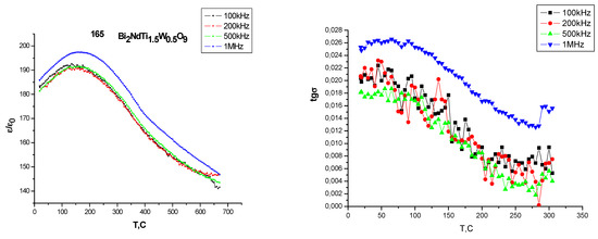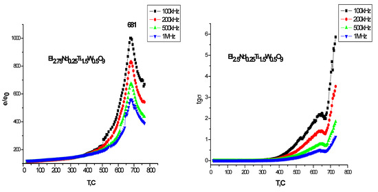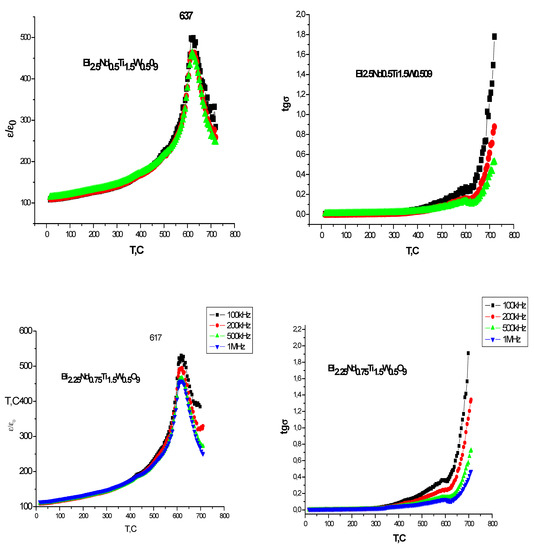 In addition to the results of structural studies, temperature dependences of the relative permittivity ε and the loss tangent tgσ were obtained at various frequencies. Figure 3 shows the temperature dependences of the relative permittivity ε(T) and the dielectric loss tangent for Nd3+ Bi3−xNdxTi1.5W0.5O9 (x = 0.25, 0.5, 0.75, 1.0) at a frequency from 100kHz to 1 MHz.