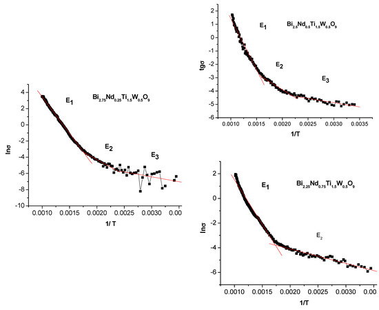 where σ is the electrical conductivity, k is a Boltzmann’s constant, and A is a constant, Ea is the activation energy. A typical dependence of lnσ on 1/(kT) (at a frequency of 100 kHz), which was used to determine the activation energies Ea, is shown in Figure 4 for the APsBi3−xNdxTi1.5W0.5O9 (x = 0.25, 0.5, 0.75). All three of these compounds Bi3−xNdxTi1.5W0.5O9 (x = 0.25, 0.5, 0.75) have different temperature ranges in Figure 4, in which the activation energies Ea have significantly different behavior. If for the first two compounds x = 0.25, 0.5, three regions of the activation energy Ea of charge carriers are observed, then we observe only two regions for the compound x = 0.75. In the low-temperature range, the electrical conductivity is predominantly determined by impurity defects with very low activation energies of the order of a few hundredths of an electron-volt. For the Bi3−xNdxTi1.5W0.5O9 (x = 0.5, 0.75) compounds, we do not observe a region with a clearly pronounced impurity conductivity.