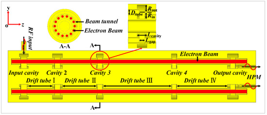 The structure of CMB-RKA is shown in Figure 1, and its operating principle can be described as follows. An RF input signal injects into the input cavity to excite an operating mode. The intense relativistic electron beams are slightly velocity modulated across the gap of the input cavity. Then, the beams are density-modulated in the drift tubes to present bunching core and peripheral electrons. In addition, the velocity is modulated again by the idler cavities, which benefits to push peripheral electrons into the bunch. Last, as the beams travel down the drift tubes and the idler cavities to the output cavity, the electrons are decelerated with converting their kinetic power into RF power. The efficiency depends on the modulated current exciting, which is closely related to the electron beams and cavities. Thus, the physical design is developed first, including the parameters of electron beam and cavities.