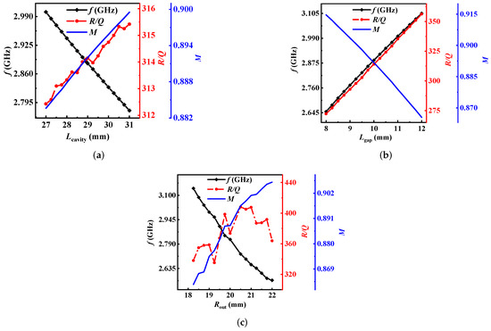 Frequency (f), coupling coefficient (M), and characteristic impedance () of the cavity as functions of (a) axial length of the cavity (), (b) gap length of the cavity (), and (c) Rout when is a constant.